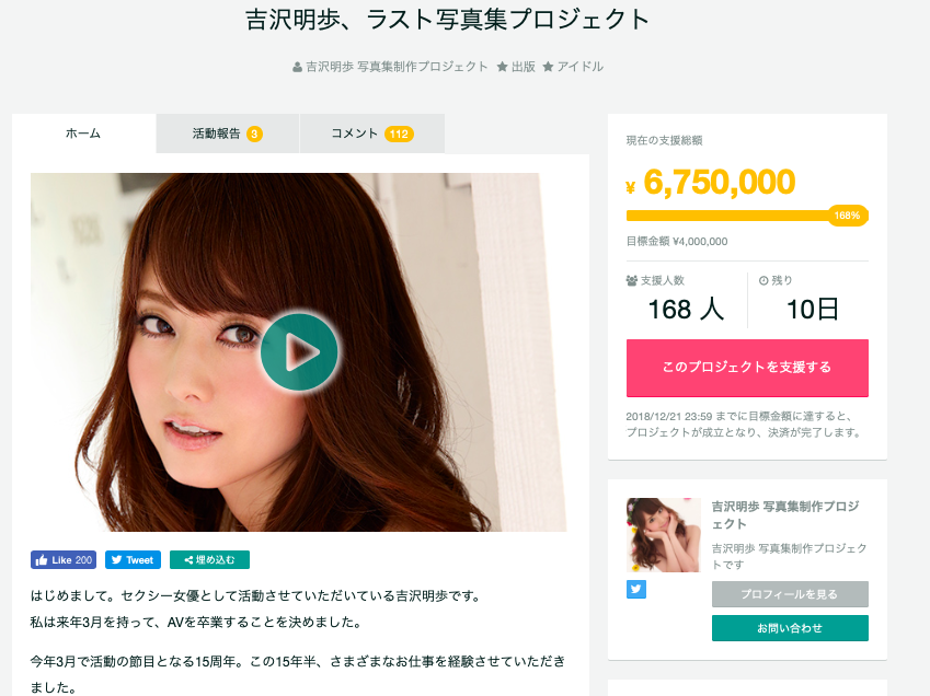 當然是衝一波能撈就撈,她啓動了募資計畫,將要用寫真集為自己的AV女優生涯畫下句點,結果10天就168個影迷抖內她675萬日幣(約台幣184萬元),另外,從明年1月開始她週週都有活動登場、3月30日就要正式收工不沾AV了ー