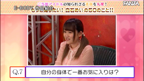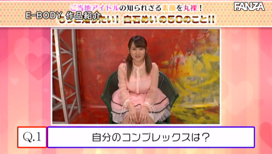 她是片商E-Body最新推出的新鮮肉體「白石めい(白石芽衣)」,就和其他在同一家片商出道的新人一樣,她有著不平凡的過去,據說在下海被男優插進去前她是東北地區非常有名的偶像,因為臉蛋太可愛再乳搖知馬力,總是讓台下為她應援的粉絲興奮得都濕了…