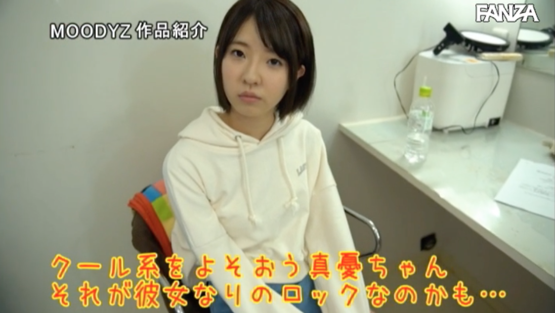 所以你以為她會穿著學生服對男優說「老師我不要」?不,完全沒那回事的,岡本真憂不只是拿著電吉他出場,在穿著上也是戴著帽子穿著帽T塑造出酷酷的風格,和一般走美少女路線的新鮮肉體完全不同…