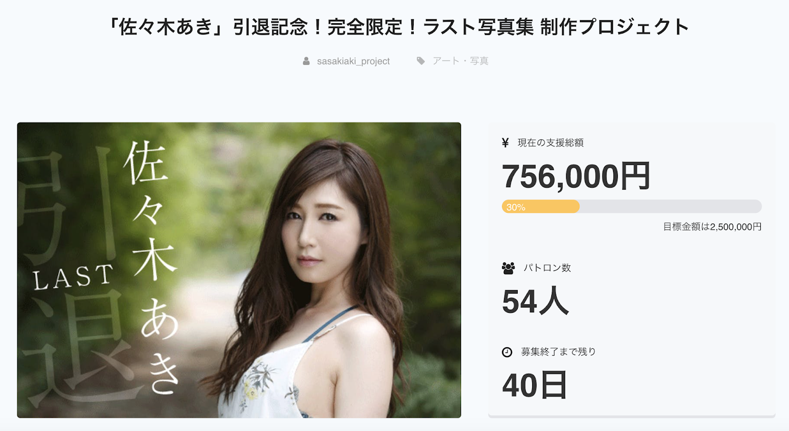 有前輩成功的例子,所以預告4月引退的佐々木あき(佐佐木明希)也有樣學樣,啓動了最後一本寫真集的募資計畫,和湊莉久相比,佐々木あき(佐佐木明希)的目標更低(250萬日幣)而影迷投錢的速度是有過之而無不及,我認為達標是輕而易舉,就不知道最後會「賺」多少錢了…