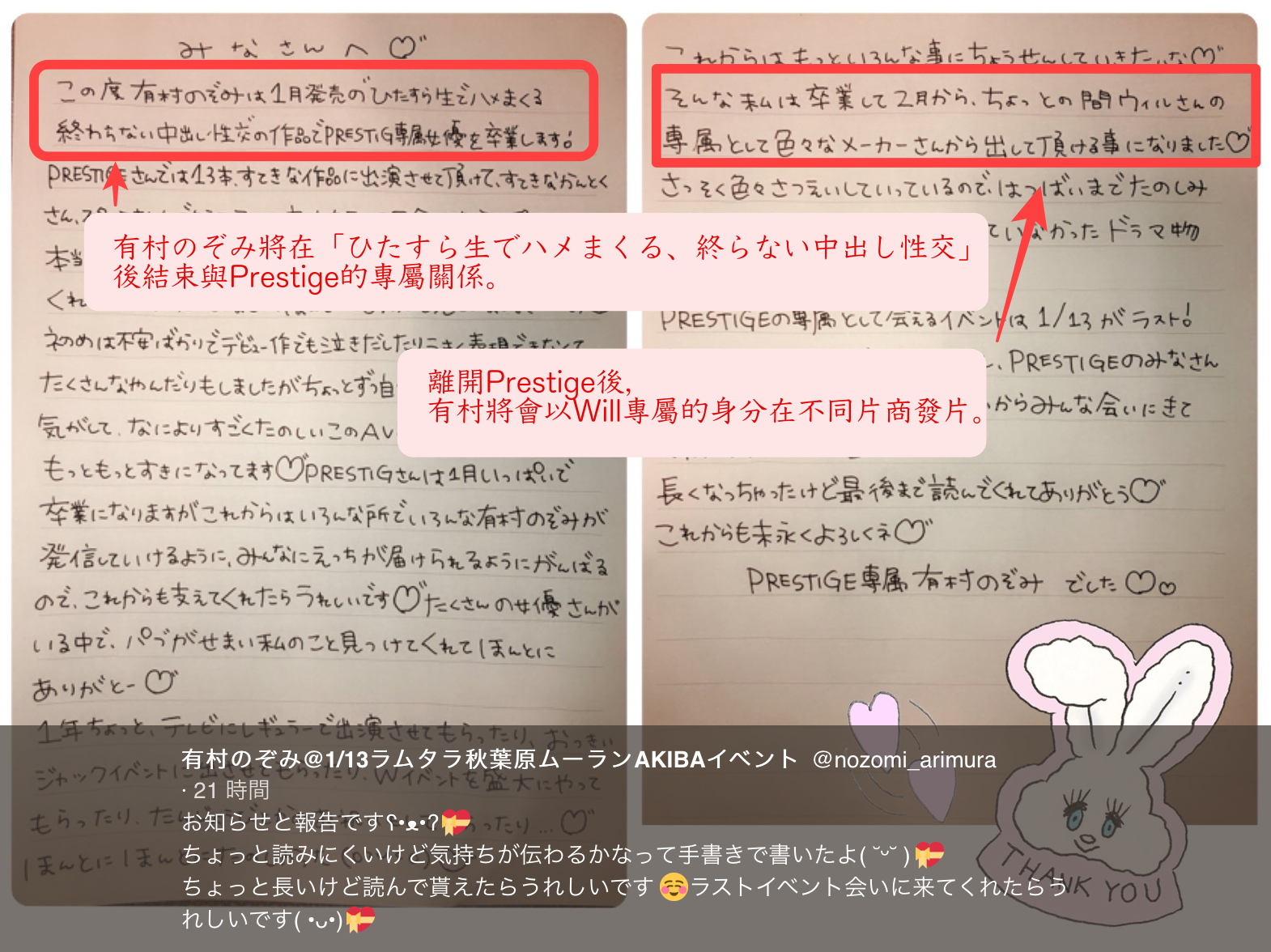 那就是「有村のぞみ(有村希)」,在最新作「ひたすら生でハメまくる、終らない中出し性交」後她正式和所屬的蚊香社(Prestige)分道揚鑣,要展開AV生涯的下一站: