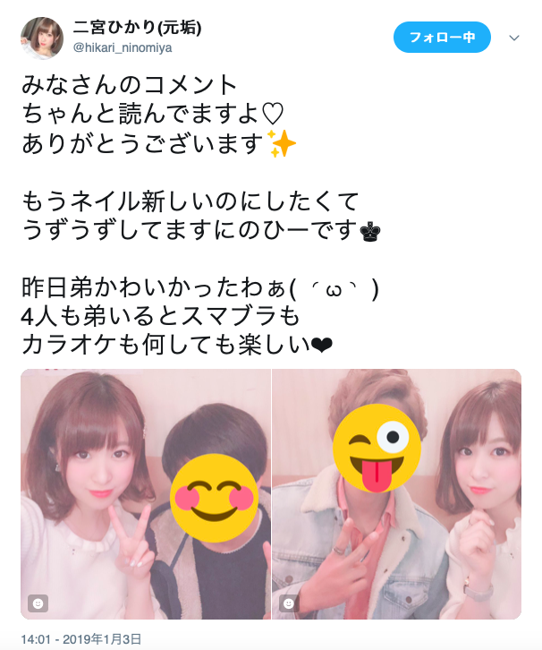 片商Moodyz的新秀、之前組團來過台灣的二宮ひかり(二宮光)在twitter上坦承自己來自小孩很多的家庭,她有四個親弟弟,大家感情很好,私底下會一起去唱卡拉OK: