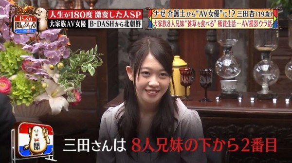 這也是三田杏後又一個來自大家庭的AV女優,當然,三田杏的狀況大家很清楚,她不只家裡小孩很多(8個)而且還是個單親家庭,媽媽為了家用是燃燒生命在工作…