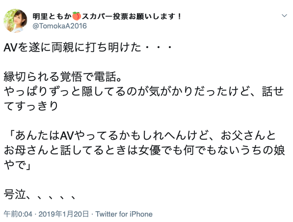 AV界知名的熟女「明里ともか(明里友香)」昨天在twitter自爆打電話給父母承認自己是個AV女優,因為她不想再隱暪了;只是你知道,我知道,獨眼龍也知道,一般的父母很難接受女兒拍AV和一堆年紀比她們大一倍的男優啪啪啪,所以明里ともか(明里友香)也說了,她已經做好了被斷絕關係的準備:
