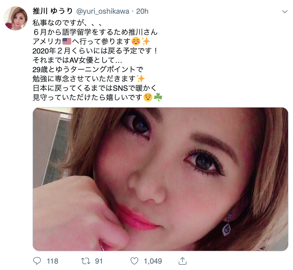 這位曾經是恵比寿マスカッツ(惠比壽麝香葡萄)的一員、身材肉感奶又大的女優是在twitter上告訴大家她要去美國遊學了,要明年(2020)2月才會回到日本,在這段期間她必須要暫時休業不拍AV了~