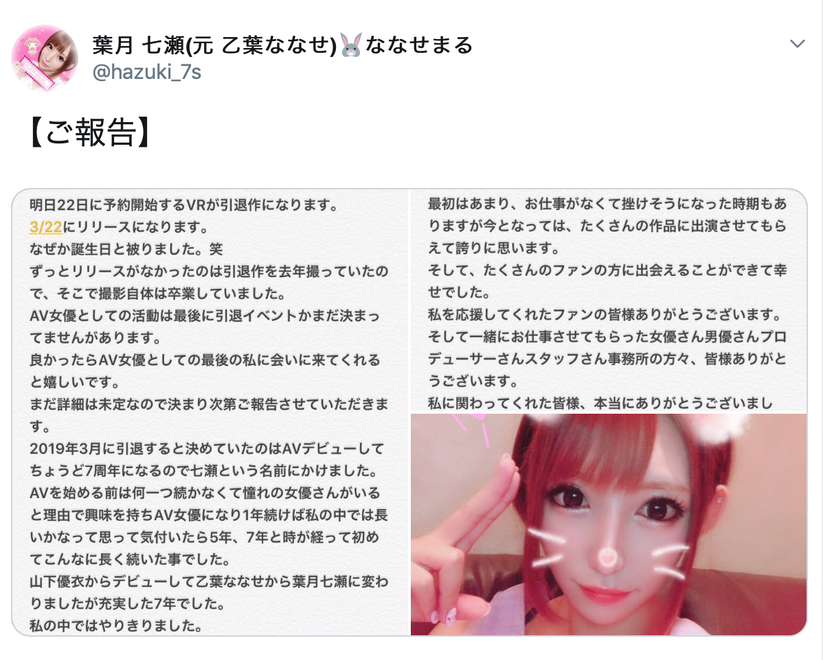 這支VR片是在去年拍的,啪完後葉月七瀬就關機封鮑了,她自己是覺得挺巧的,藝名裡有「七瀬」而她在AV界也待了7個年頭:從出道時叫山下優衣、後來來台灣時的乙葉ななせ(乙葉七瀨)到現在用葉月七瀬的名字引退,r雖然剛出道時也曾為了沒有片商邀約所苦,但這些年來她過得很充實,就算現在要引退了還是覺得這份有史以來做得最久的工作好棒棒: