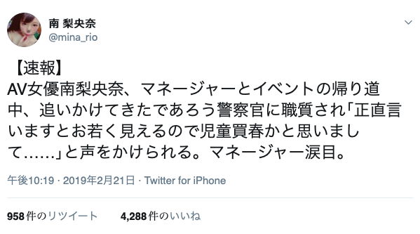 別擔心,南梨央奈沒有涉及不法,事情是這樣的:不久前,舉辦完活動的南梨央奈在與經紀人回家的路上被警察攔下,對方一臉正經地和他們說:「看妳(南梨央奈)長得這麼幼齒,我還以為是未成年少女賣春呢…」