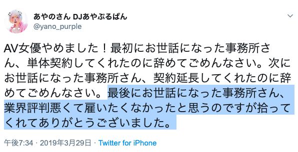 簡單地翻譯就是叶彩乃謝謝現在這家事務所,雖然她在業界的風評不好仍然願意雇用她。寫到這邊各位可能覺得奇怪了,先別提叶彩乃這個離職聲明來得突然,最後她怎麼會說自己在業界的風評很差?真的嗎?