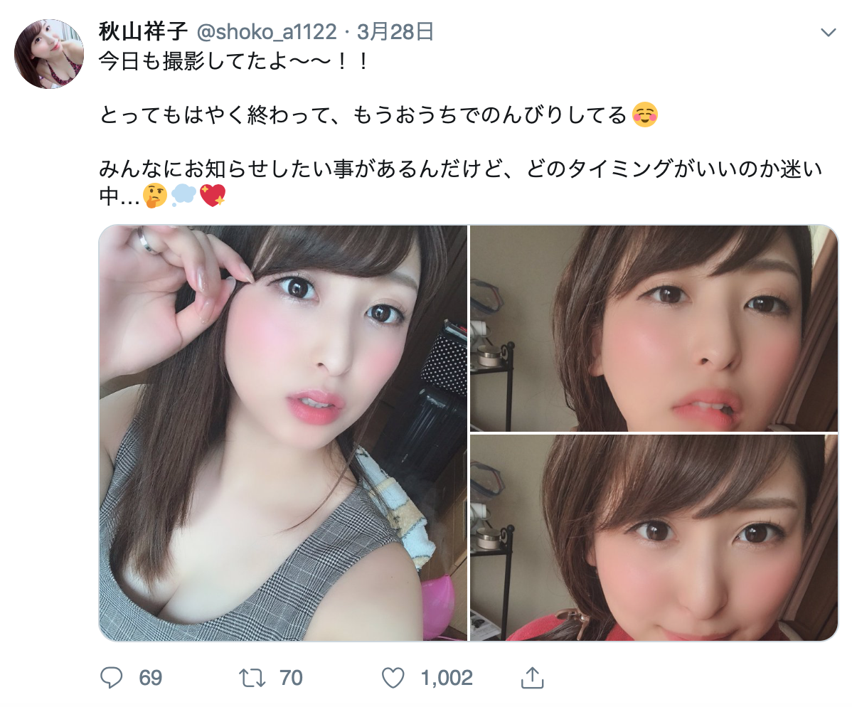 對照另一篇在twitter的發文就知道狀況不妙:雖然秋山話說得很隱諱,但文章中寫的「有件事想和大家分享,卻又不知道什麼時候說好」其實已經是明示了,這位在知名作品「処女宮」出道、曾經是市場最好的巨乳美少女講的就是引退的事了: