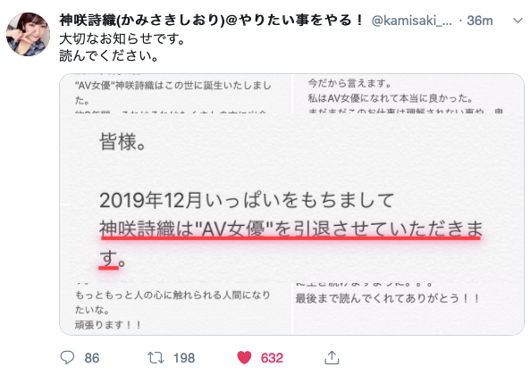 與昨天的桐谷なお(桐谷奈緒)一樣,神咲詩織並沒有明說自己不想幹的原因,不過她有提到雖然這份工作(AV女優)被很多人看不起,但她一直認為自己在這一行成長了不少,在剩下的時間裡她會全力做好自己的工作,讓大家留下最美好的印象~