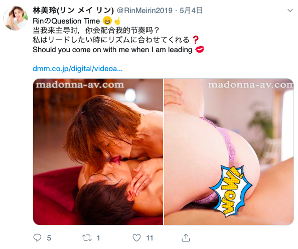 所以雖然不用字幕就聽得懂林美玲說「我下面流了好多水」以及「從後面來好舒服」,但她講愈多你就愈知道一開始台湾出身的設定有問題。而她也不只在作品裡講中文,在twitter上她也是中日文雙聲道甚至還夾雜著一些英文,真的是非常努力推銷自己~
