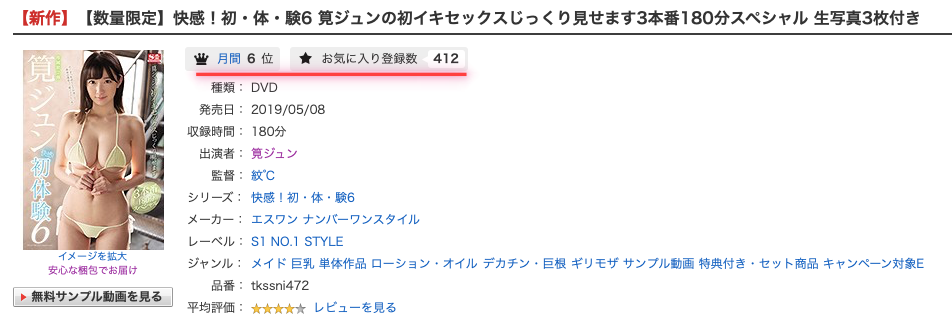 為什麼我這麼關心這位新人呢?一來是有人在問,二來是事務所很看好這位女優,要將她打造成第二個橋本ありな(橋本有菜),期待值這麼高的新人是該好好注意;最後則是因為筧ジュン(筧純)前兩支作品銷售成績超乎想像的好,沒有趁勝追擊真的很怪:
