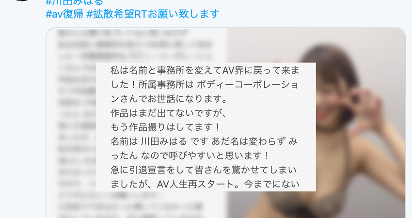 然後今天,她新的藝名「川田みはる(川田美晴)」上線、也公布了事務所ボディコーポレーション(Body Cooperation),宣誓重回AV界了~