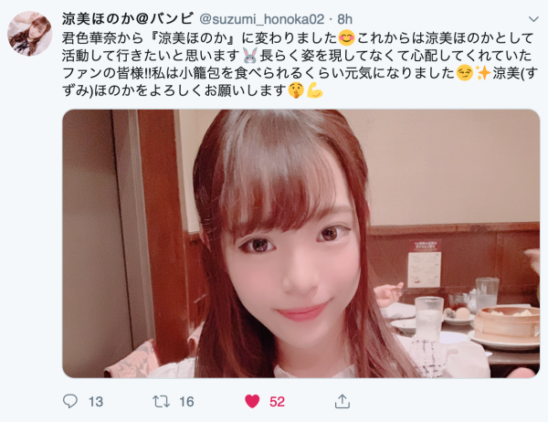 還記得她嗎?推文中一開始她就說了,她是君色華奈,也就是在ideapocket專屬出道的君色花音。但現在,她是涼美ほのか(涼美穗花)了…