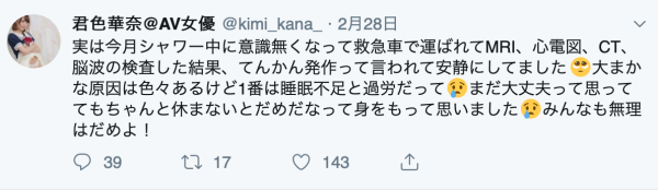 大家可以看看她還叫君色華奈時的最後一篇推文,她說自己在洗澡時突然失去意識,送醫後又是核磁共振又是心電圖又是斷層掃描還檢查了腦波然後她就再也沒更新了。不過話說回來,如果你和夜影一樣想把她納入後宮就知道從去年下半年開始這位女優的狀況就很不穩定:原本預定要和橋本ありな(橋本有菜)和桐谷まつり(桐谷茉莉)一起搞偶像團體卻三天兩頭掛病號缺席,更可怕的是她似乎非常缺錢、會在twitter寫出經紀公司不想看的東西…