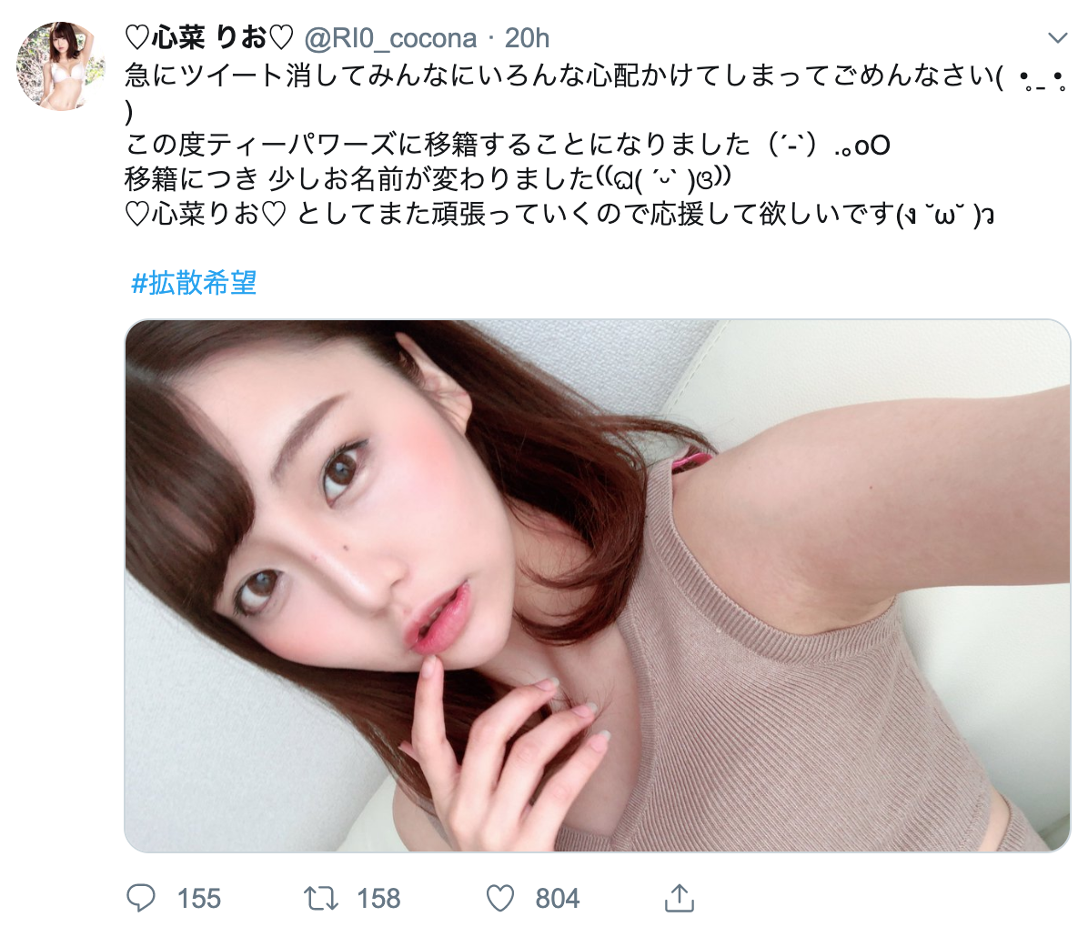 昨天已經告訴大家了,女優會離開事務所不脫「錢」和「人」的問題,大家都想多賺點錢、大家也都想開心工作,如果做得不開心又賺得不夠多誰都不想待。有關真奈りおな(真奈里緒菜)的移籍改名我是有得到一些說法,失去原本培養要當橋本ありな(橋本有菜)接班人的頂級新秀任誰都會難受,但究竟是誰對不起誰現在很難做評論,只能祝福這家經紀公司能找到更好的新人、而現在叫心菜りお(心菜里緒)的這位女優能得到她想要的…