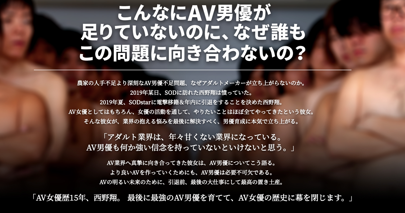 她要培養AV生涯中最後也最強的男優,檯面上的老屁股她通通不要,而是要舉辦徵才活動自己試用過才算數,只要你18歲以上、拿得出證明身分的文件、不論學經歷及女性經驗,就算是處男都可以應徵,西野翔會用她在這一行鍛練了15年的選球眼找出最強的馬眼,為日後入行的女優謀性福~