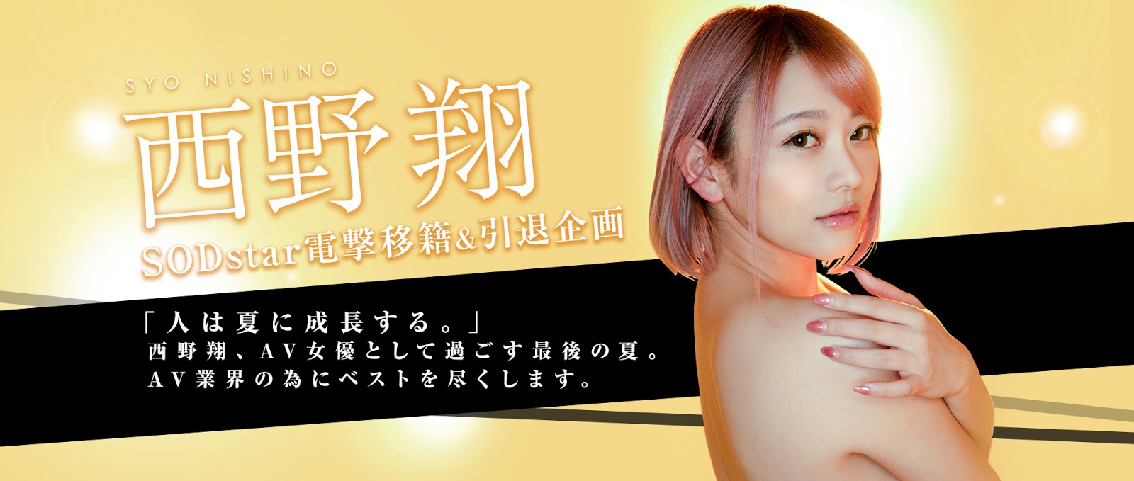 出道15年的她不只是突然跑去了SOD Star發片而且要進行的還是引退企劃:是的,曾經說要做女優做到死、從國民美少女演到国民の人妻的她是為了引退才從Will集團(北都)跳到SOD發片的。雖然我不知道她為什麼不做了,但很明顯地,西野翔不是像瑠川リナ(瑠川莉娜)一樣去SOD被中出射到飽的、而是要培養更強更猛的下一代: