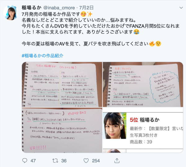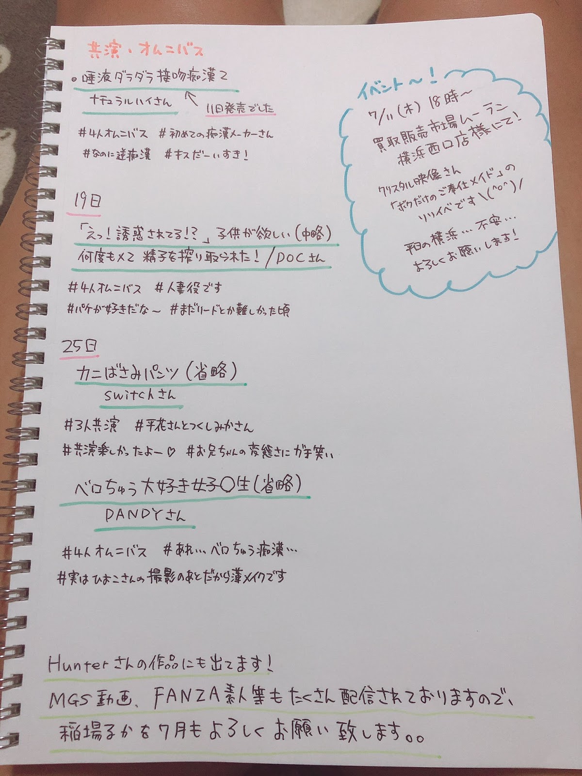 她是用手寫的方式整理出6月和7月發售的作品,以7月為例,她1號、4號、5號、12號、13號、19號、25號和26號都有個人作品上市,再加上共演作品根本就是最精銳的發片機器,這一行能贏過她的女優大概一根手指都算得出來~