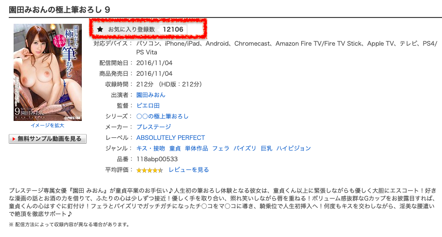 那園田みおん(園田美櫻)呢?從影迷在FANZA(就是DMM)網站上的按讚來分析就是幫處男開苞的企劃ー大家可以看到,她在2016年的作品「園田みおんの極上筆おろし 9」一共累積了超過1.2萬個讚是出道以來最高,也難怪接下來Prestige又再一次替她拍了「園田みおんの極上筆おろし 2nd 27」這片: