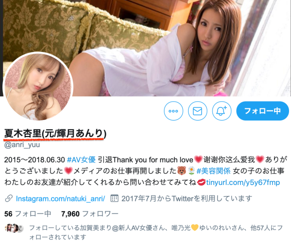 但沒多久對方又來了聯絡,說她們算過筆劃後覺得「夏木杏梨」這個名字不好,想要把名字改成「夏木安梨」。這時我才知道原來夏木的老闆是用筆劃的方式為女優占卜吉凶,只是很有趣,當這位女優重啟twitter時卻又出現了「夏木杏里」這個新版本…