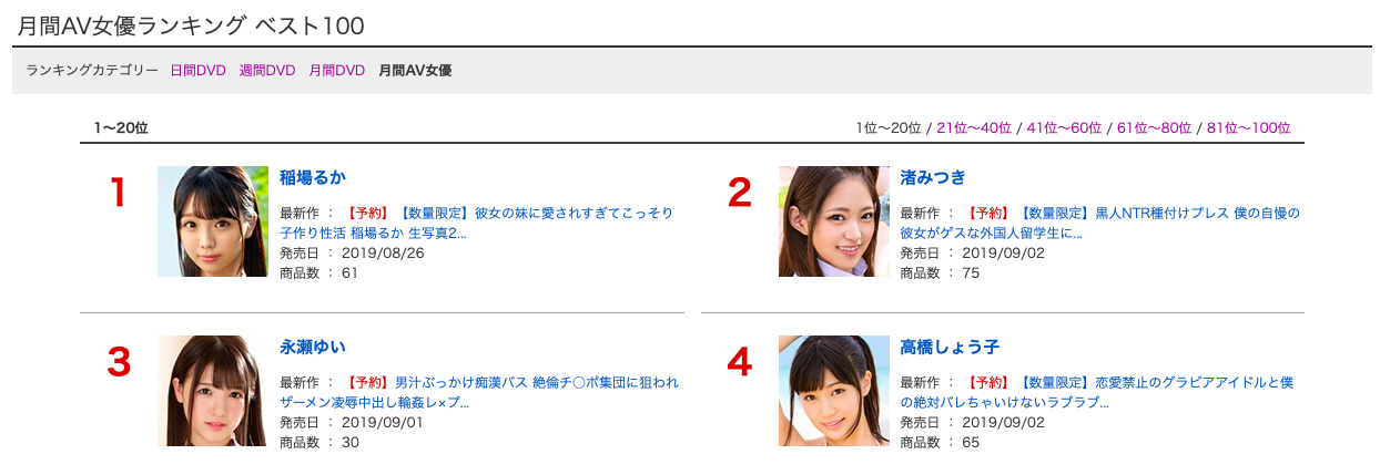 雖然高橋しょう子(高橋聖子)仍然是作品最賣的女優,不過在計算累積銷售量的「FANZA月間AV女優ランキング」排行榜她已經打不贏那些發片機器了:在才剛公布沒多久的7月排行榜是由稲場るか(稻場流花)登上冠軍寶座、第二名則是由貧乳美少女「渚みつき(渚光希)」拿下…