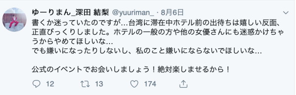 為什麼?一來是沒自信,雖然從攤位女優變成大會的銀卡是肯定,但深田結梨一直怕粉絲不喜歡自己,所以她吃不下飯、一直跑廁所、三不五時就找經紀人心理輔導;另一方面她又很在乎什麼該做什麼不該做,在工作的時候絕對全力以赴,活動結束她就不想去理那些守在旅館要簽名的人(對不起,我不認為他們是粉絲),所以才有了這篇文: