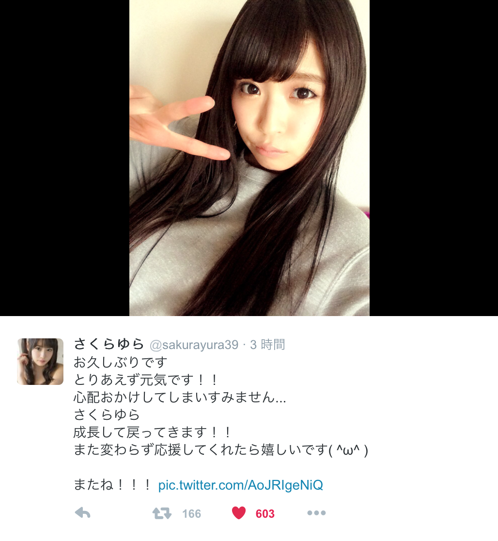 算了,人既然回來了就少酸事務所一點,反正從一開始先說她病了又說她去留學就知道這家號稱「培養出蒼井そら(蒼井空)」根本沒有處理危機的能力。重點還是さくらゆら(櫻由羅)這一篇twitter推文實在太重要,那不只是報平安而已更有可能全面回歸的信號: