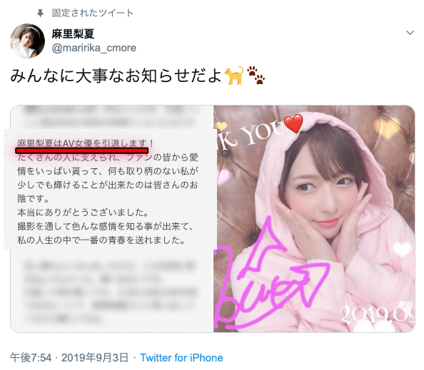早上還在講「引退」這兩個字像傳染病擴散開來,我們損失了園田みおん(園田美櫻)、失去了AKB48體系出身的紗凪美羽,連參加FANZAアダルトアワード(FANZA成人大賞)的星奈あい(星奈愛)也宣布AV休業暫不拍片…但還沒完喔,就在剛剛,另一位曾經入圍FANZAアダルトアワード(FANZA成人大賞)的女優麻里梨夏也宣布不玩了~