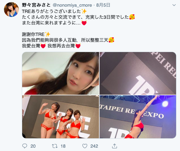 在討論TRE台北國際成人展女優人選的會議上,我以近乎耍賴的態度要求大家採用「野々宮みさと(野野宮美里)」,理由很簡單,因為她之前以野宮さとみ(野宮里美)之名瘋狂發片的模樣太令我著迷,看到事務所推薦她來台灣參加TRE,我當然要自肥一下~