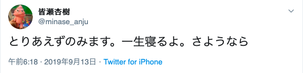 以安西ひかり(安西光)之名出道的皆瀬杏樹在深夜於twitter瘋狂發文,每一篇的內容都是怵目驚心、每一篇的結尾都是在向大家告別,是的,最後一篇是停留在3個小時前的6點18分,皆瀬杏樹說自己要去睡一輩子,再見。