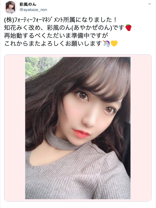 這是她被事務所剔除不得參加TRE台北國際成人展後首度露面,只是名字變了,現在的她名喚彩風のん(彩風音),事務所也從原先的Arrows變成了44Group…