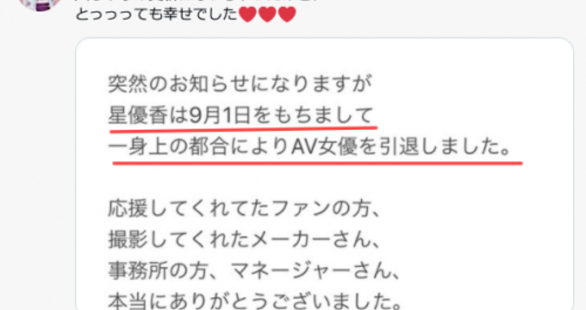 昨天晚上她突然在twitter發文說已經於9月1日引退,理由是「個人因素」ー意思就是不用多說直接不玩,接下來就是感謝粉絲感謝事務所感謝片商,這一年半的時間她過得很開心⋯