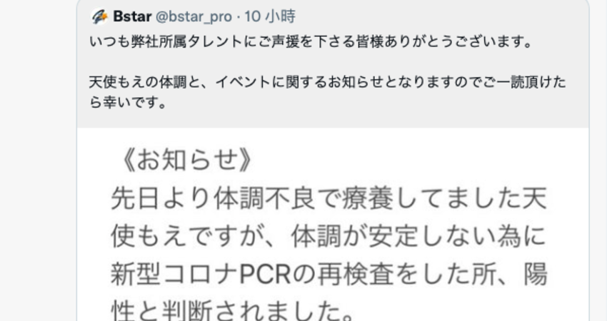 這是BStar第二位成員確診了,之前是沒有拍AV的小夏つむぎ(小夏紬),雖然年紀很輕但她的狀況蠻嚴重的,拖了很久還沒好;而天使もえ(天使萌)確診除了要祝她早日康復外也要密切關注擴散的狀況,因為不只8月28日有實體活動接觸了很多人,隔天她還在社長家裡直播,那時不只社長還有另一個經紀人在場,經紀人如果又去帶其他女優的話⋯