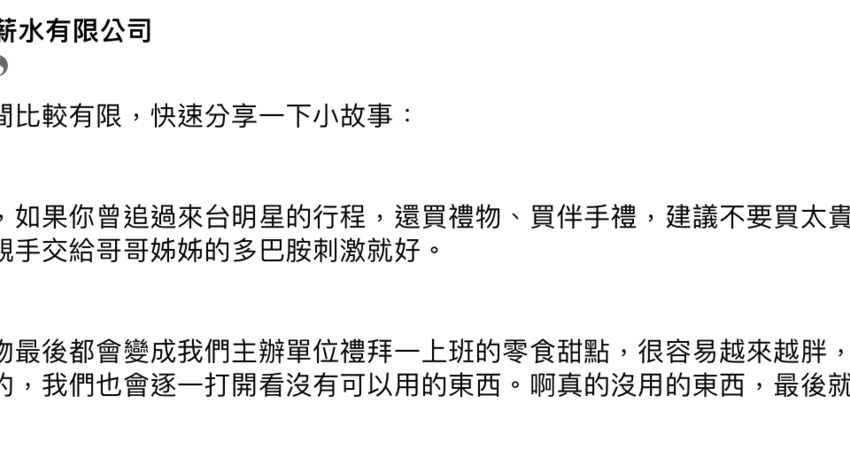 我看了一下,原來是上週韓國BLACK PINK來台,有個粉絲團把邀請外國藝人的幕後秘辛寫了出來:包括藝人們不太願意打卡標記自己在台灣、人前人後一個樣以及對影迷送的禮物視若無睹全扔掉⋯坦白說,以我曾經在唱片公司工作以及在跨年晚會擔任STAFF的經驗他說的蠻有參考價值,我也不覺得他把這些事實赤裸裸地寫出來不好,但,AV女優恰恰好不屬於他所描寫的範疇中〜