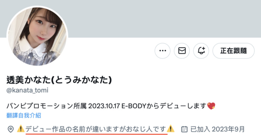 但她在X(Twitter)平台的自我介紹有這麼一句,デビュー作品の名前が違いますがおなじ人です,意思是雖然和出道作的名字不一樣但她們是同一人喔: