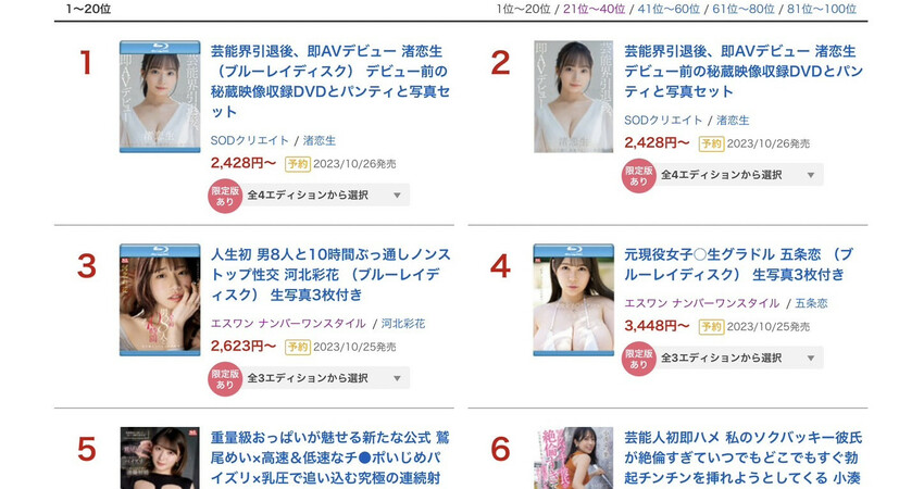 所以河北只能拿到第三(因為渚恋生是拿下了第一第二,藍光及DVD版本),不過片商S1倒不是毫無收穫,他們自寫真界找來的「五条恋(五条戀)」領域展開無量空處拿下了第四,X(twitter)兩天就拿到了超過8600個追蹤,火力相當旺⋯