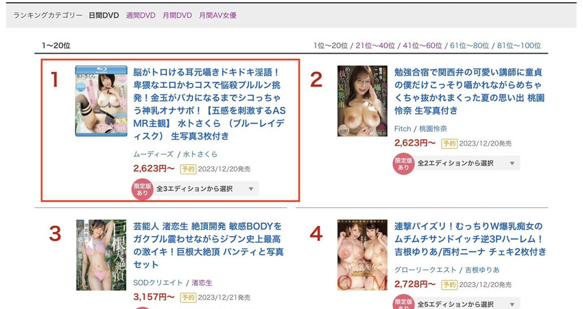 雖然藝能人渚恋生(渚戀生)被超巨根男優ウルフ田中(Wolf田中)捅得吱吱叫,不過片商Moodyz的專屬女優「水卜さくら(水卜櫻)」告訴我們,只是她固定發片,這段的銷售冠軍就是她的: