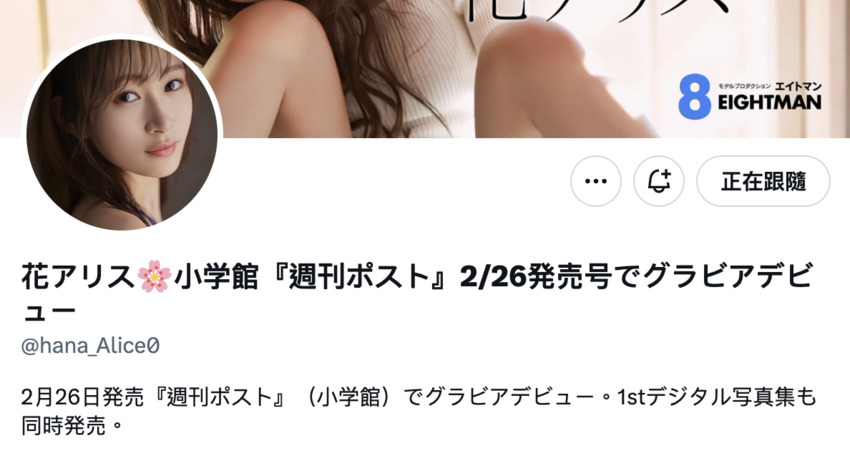 這就是為什麼明明X的帳號(https://twitter.com/hana_Alice0)早就好了卻在昨天才放上照片的原因吧,除了是塑造神秘感之外就是不要讓大家一直講エイトマン(8MAN)又挖人家的女優來用了,最好登場的時機就是雜誌的寫真要上以及片商情報解禁的時候,這樣子大家就不會把焦點放在エイトマン(8MAN)又挖人家的資源,然後還很常常是同一家經紀公司的⋯