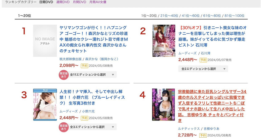 第一名是還沒有封面的「ヤリマンワゴンが行く!!ハプニング ア ゴーゴー!!森沢かなとリズの珍道中 魅惑のセクシー濡れジト目で疼きMAXの痴女られ車内性交」,由於是知名系列作加上現階段最強的發片機器然後還送拍立得,不能說是不意外啦,但至少分析得出原因,也算可以接受〜