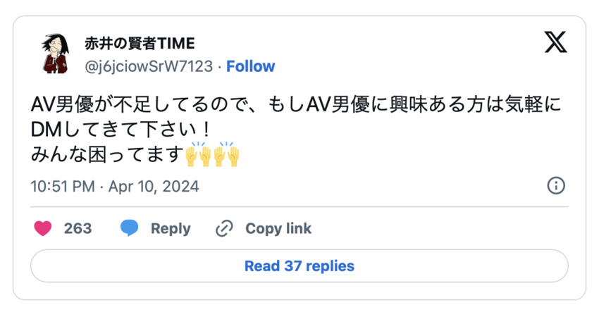 著名的AV男優漫畫家、也是事務所アルヴィロッソ(Alvirosso)的代表「赤井さん」是在自己的X(https://twitter.com/akaiakaisan)揭露了這個狀況,請注意喔,他是用「空前不足」來形容目前AV男優短缺的困境,然後他拜託有興趣當AV男優的30公分們趕快私訊,「也許你就是AV界救世主」: