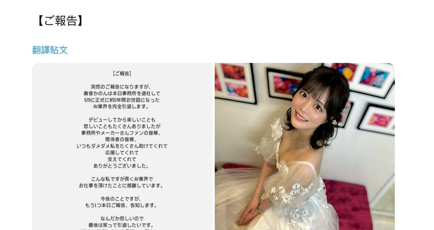 才結束休業並且成為片商「無垢」專屬女優的奏音かのん(奏音花音)昨晚突然宣布引退,5月9日就會離開事務所,結束了5年的AV生涯⋯
