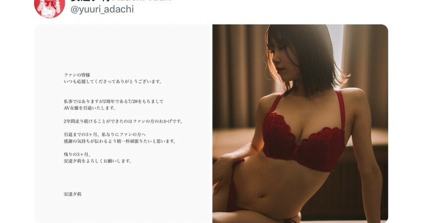 人就是失去才會知道遺憾,想當初經紀公司送來可以在台灣舉辦攝影會的名單裡面就有她,我們ForAVer經過非常激烈的討論後選擇了「未歩なな(未步奈奈)」—而這也正是我認為安達夕莉的困境所在,剛出道時她不只外型評價很高社群也三頭車跑得快,可是當她的X(https://x.com/yuuri_adachi/)衝到80,000以後狀況就變了:因為被暗鎖(Shadow Ban,被故意壓低流量)讓她的追蹤數停滯了好一陣子,同時事務所的發展重心也悄悄地往未歩なな(未步奈奈)和浅野こころ(淺野心)傾斜,所以發展雖然穩定但我總是有些遺憾,明明也是童顏巨乳的優質苗子啊,不過還沒有完全燃燒就要引退了⋯