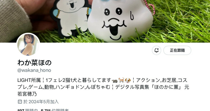 一塊兒來看這個於X上出現的新帳號(https://twitter.com/wakana_hono),她的名字叫わか菜ほの(若菜穂乃),經紀公司LIGHT的人〜