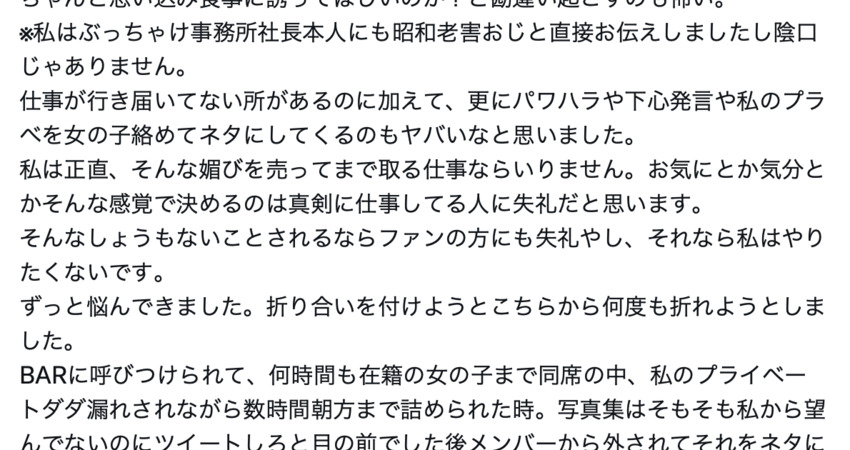 用字用得很重,我想八蜜凛應該是真的極度不滿事務所而且已經做好了最壞打算,接著她敘述自己在事務所碰到的狀況:「不僅工作分配不到位還被職場霸凌,私事被拿出來開玩笑,那都讓我極度不舒服;如果要靠討好長官才能拿到工作那我寧可不要,而長官如果是以情緒來分配工作那也是對認真的人不公平以及對粉絲非常失禮,這不是我想要的。」
