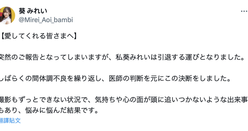 總共8個月的AV生涯,就差不多是企劃女優在這一行的平均壽命,即便我覺得她長得很可愛、肉肉的Body感覺很好吃也撐不過一年ー沒辦法,在もぎたて素人出道說明了她起點並不高,反映在社群就是到現在她的X(https://x.com/Mirei_Aoi_bambi)追蹤也才3000多人,不過葵みれい(葵美玲)在引退聲明有說了,她不是混不下去被逼走的,而是ー
