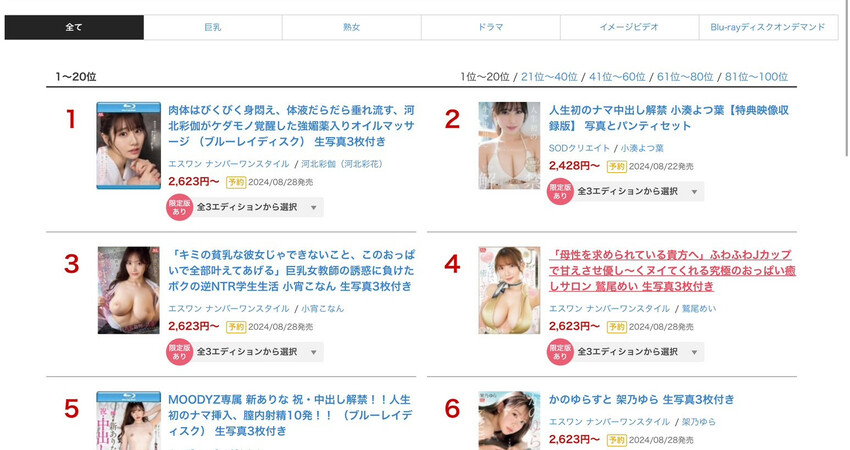 這是本週FANZA的銷售排行榜。