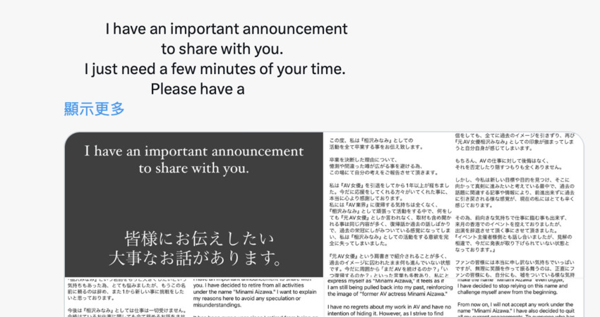 為什麼?就她的說法,引退這一年多雖然從來沒想過回歸(AV界),但不管做了什麼都會被稱為「前AV女優」,然後受訪也大多是圍繞著AV女優的過去以及未來是否會復出拍A片這兩個問題,她覺得自己被困在「相沢みなみ(相澤南)」這個名字無法前進,尤其是到現在她還是經常收到像是「你還在拍AV嗎」以及「什麼時候回來拍片」的私訊,引退一年多一直沒改變,讓她壓力很大⋯