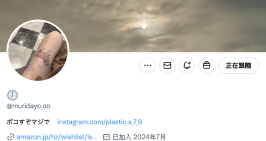 她的頭像是個大腿上的刺青,而這個人是前陣子狀況很多的「弓乃りむ(弓乃凜夢)」:大家都知道她是拍過無碼的前寫真偶像須田凛夢,先在SOD專屬出道後引退了一陣子、復出後在另一家片商ダスッ!(DAS)繼續擔任專屬女優但不久前突然瘋狂刺青然後說要賣有22萬追蹤的X本帳(https://x.com/7_plastic),明顯是又不玩了⋯