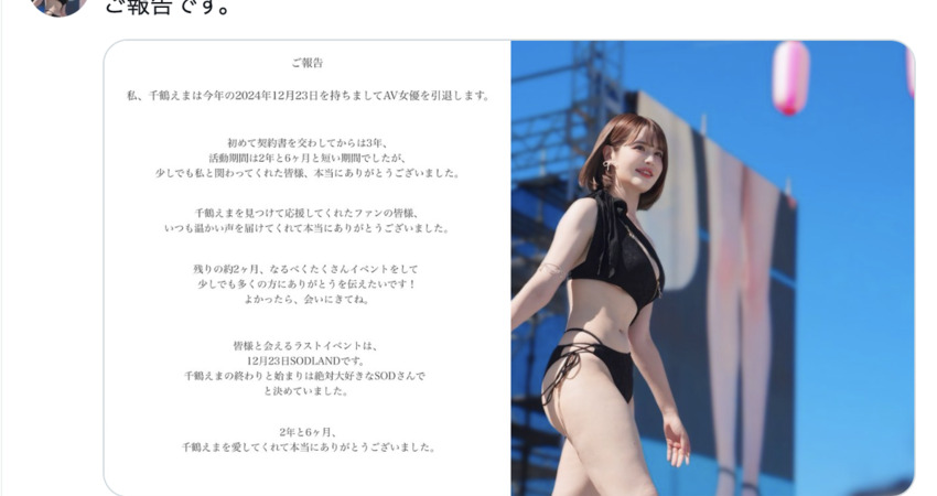 SOD STAR出道、日澳混血的大奶妹「千鶴えま(千鶴惠麻)」剛剛宣布引退,她說自己在12月23日後就不做女優了,謝謝大家這些日子來的支持〜